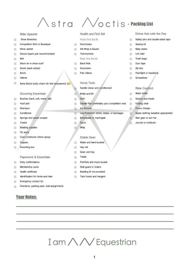 At Astra Noctis, we believe that success starts long before the arena — it begins in your packing process. Your tack, gear, and clothing must reflect readiness, elegance, and the spirit of being AN Equestrian. Below is our detailed equestrian show checklist to guide your preparation for any competition.