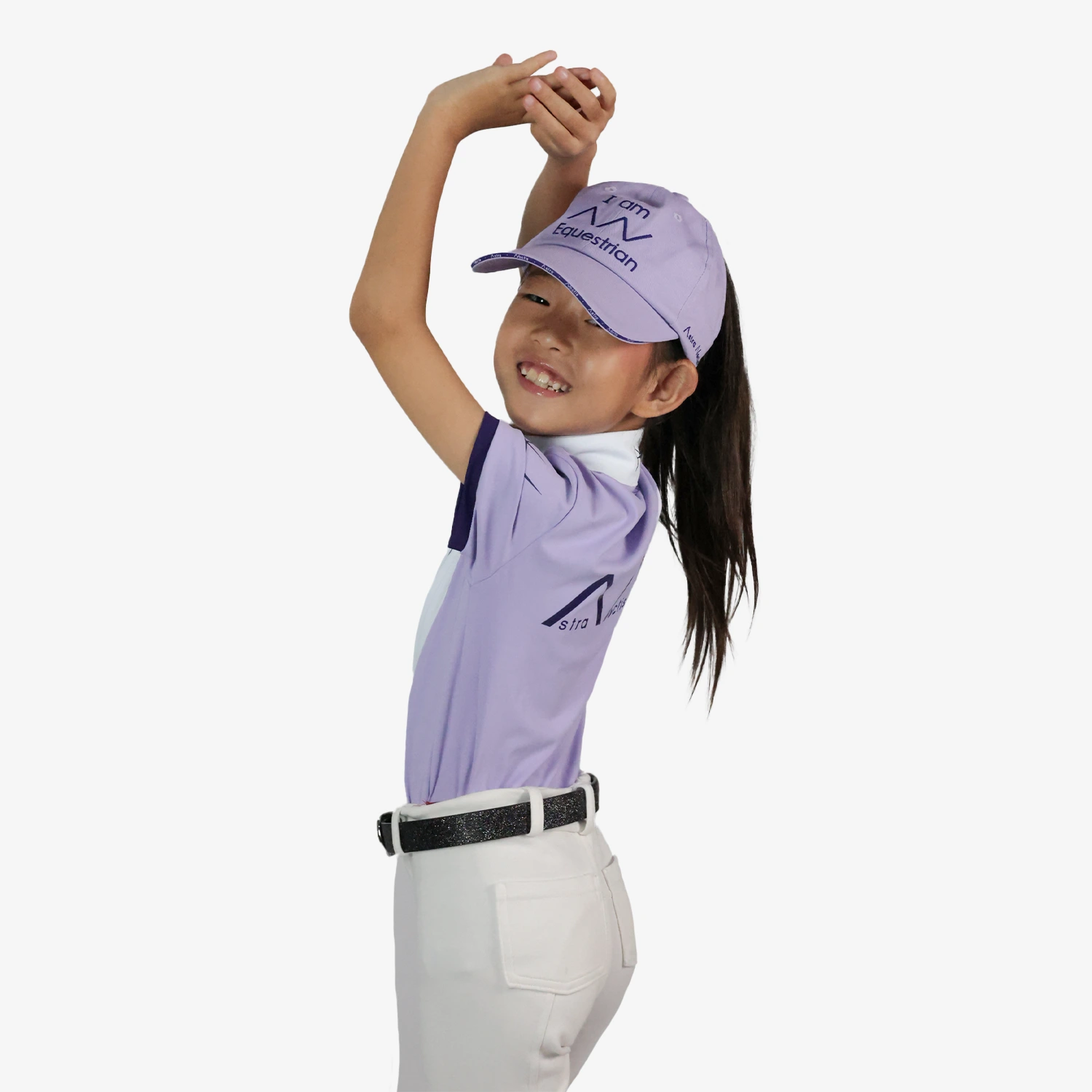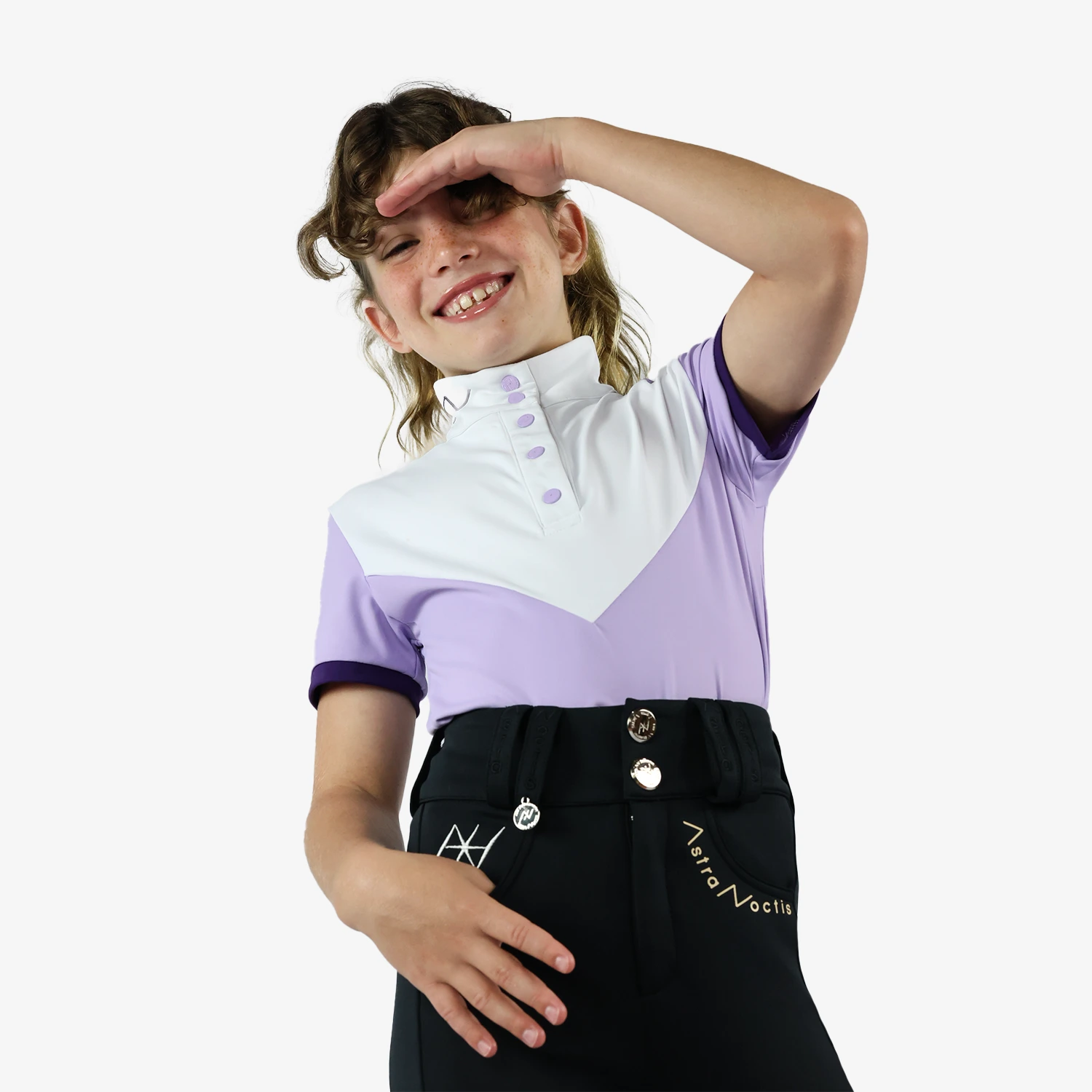 Combining light and dark purple tones, this competition shirt brings both design and function to the forefront. The front features a triangular detail, allowing for comfortable wear under your competition jacket, while dark purple accents add elegance throughout. With our AN silicone logo and “I am AN Equestrian” slogan on the back, along with embroidered details on the collar, this shirt perfectly blends classic competition style with a modern twist.