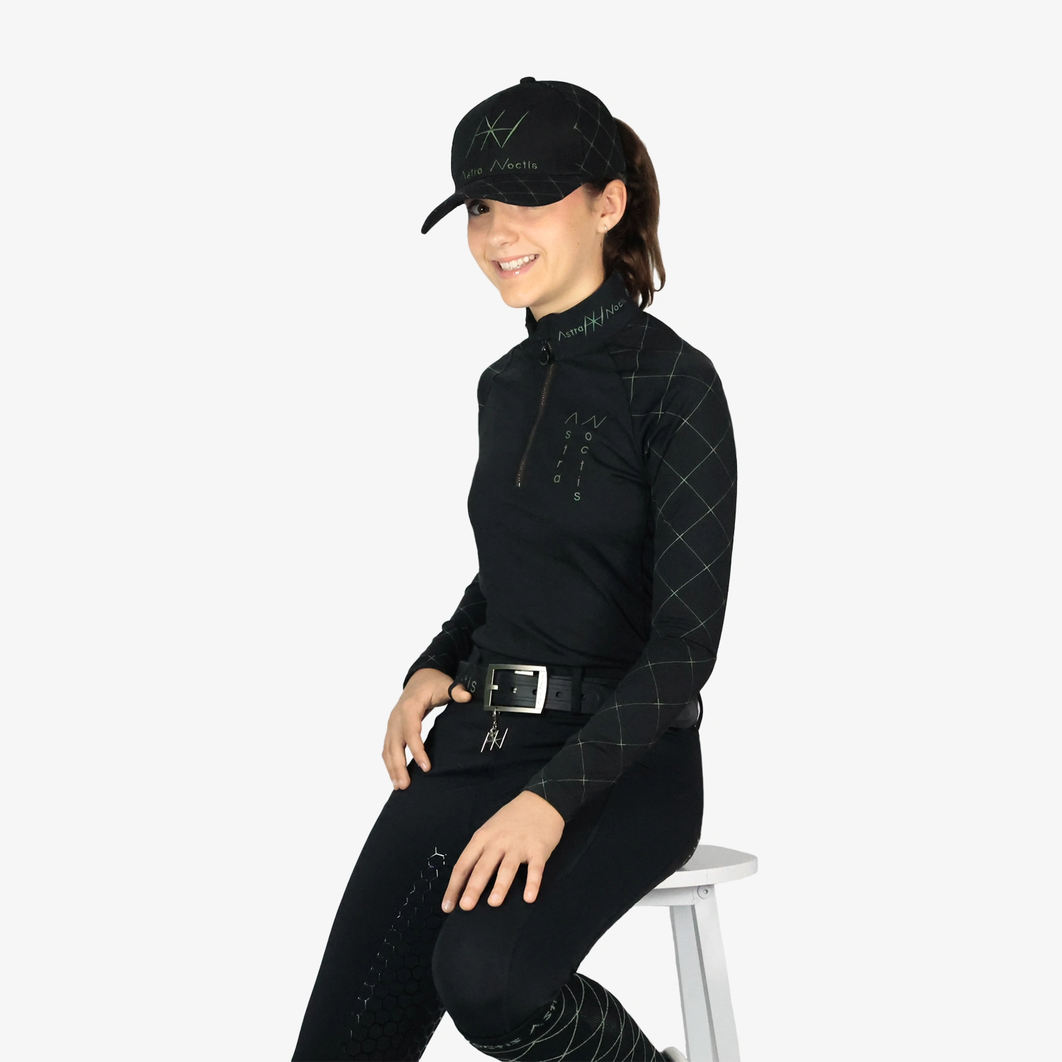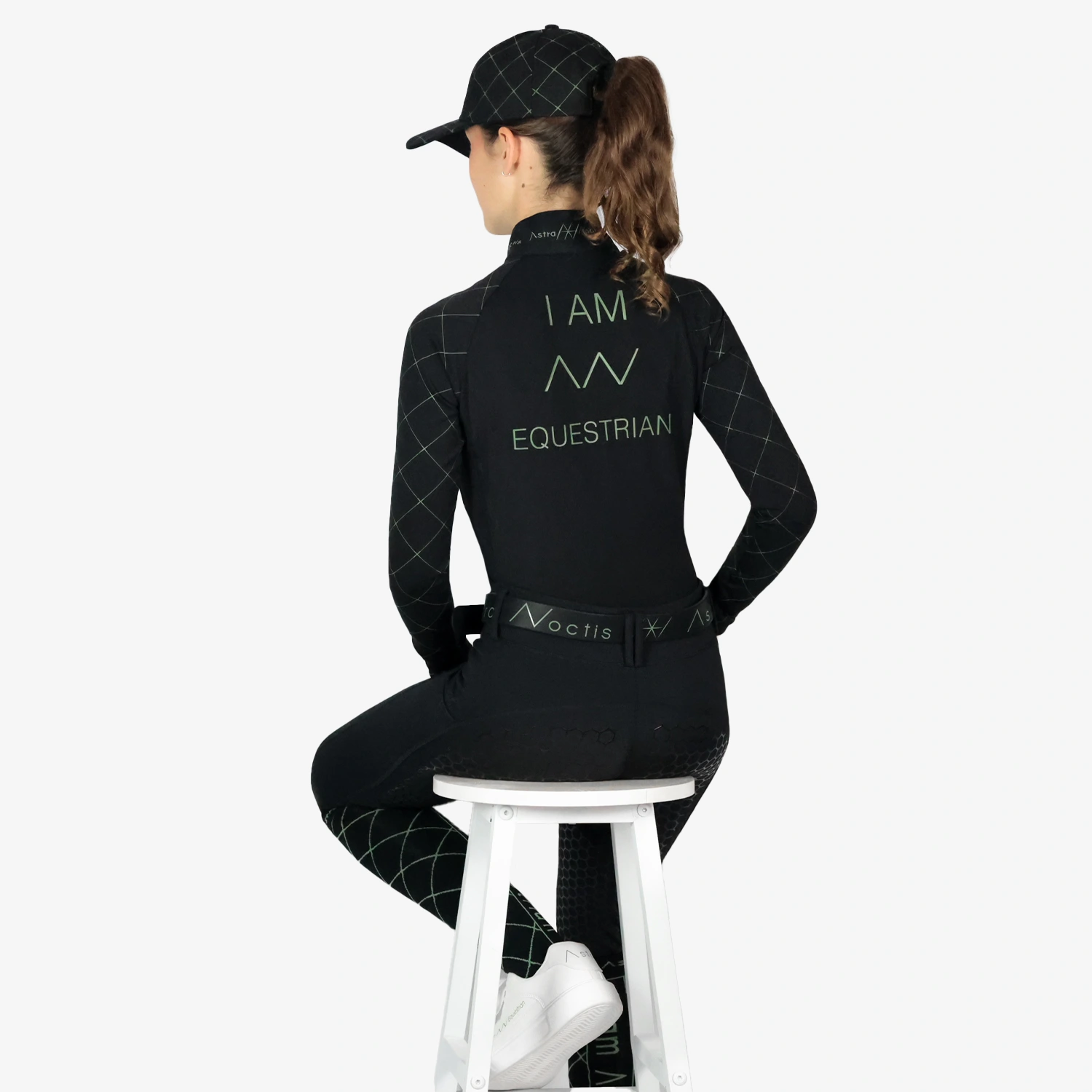 This sleek black baselayer comes with two accent options: luxurious gold or subtle sage. Designed to balance sport and sophistication, this baselayer features a unique sleeve pattern that exudes elegance. The bold “I AM AN EQUESTRIAN” slogan on the back ensures you stand out. Loved by riders for its perfect fusion of timeless black with eye-catching accents, this piece is a must-have for those who appreciate style and performance.