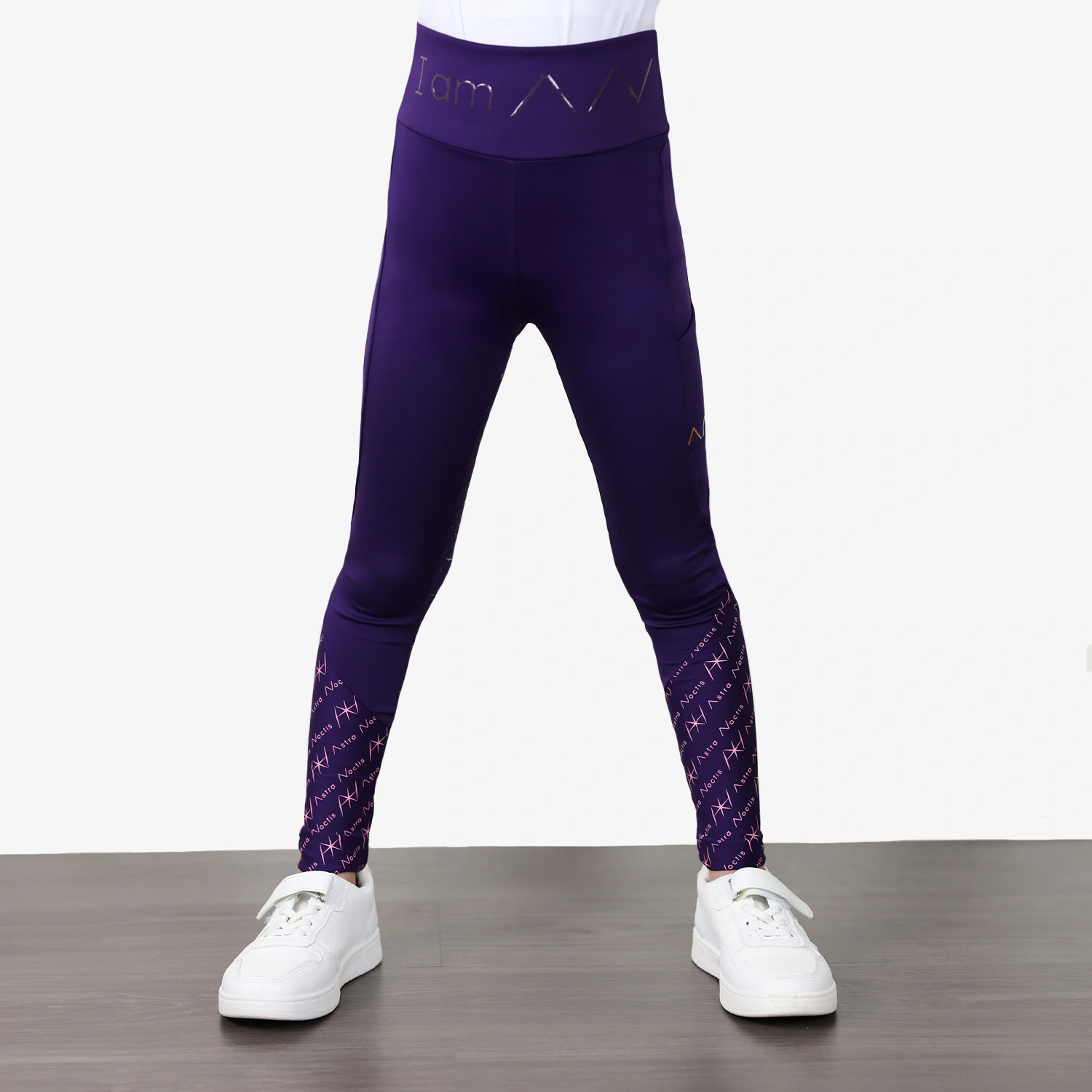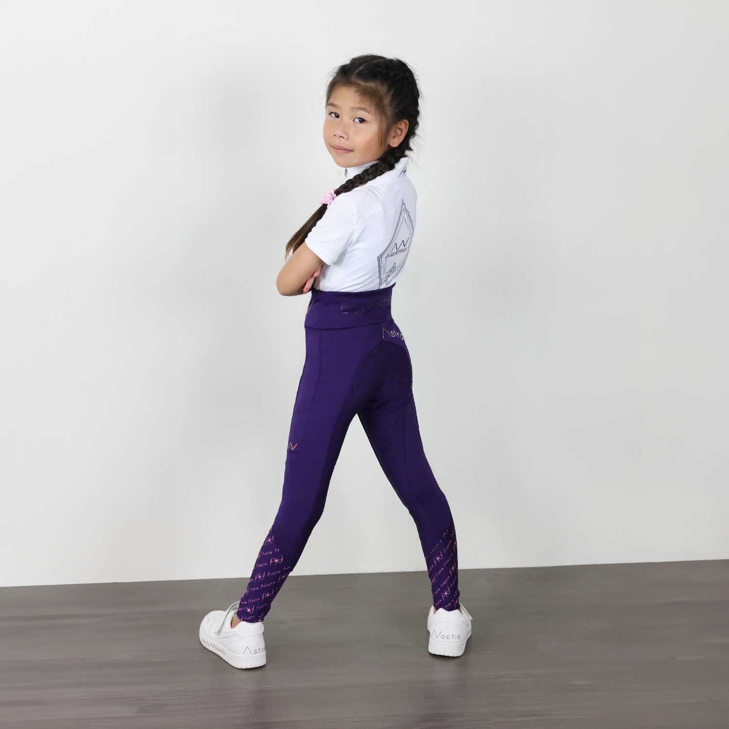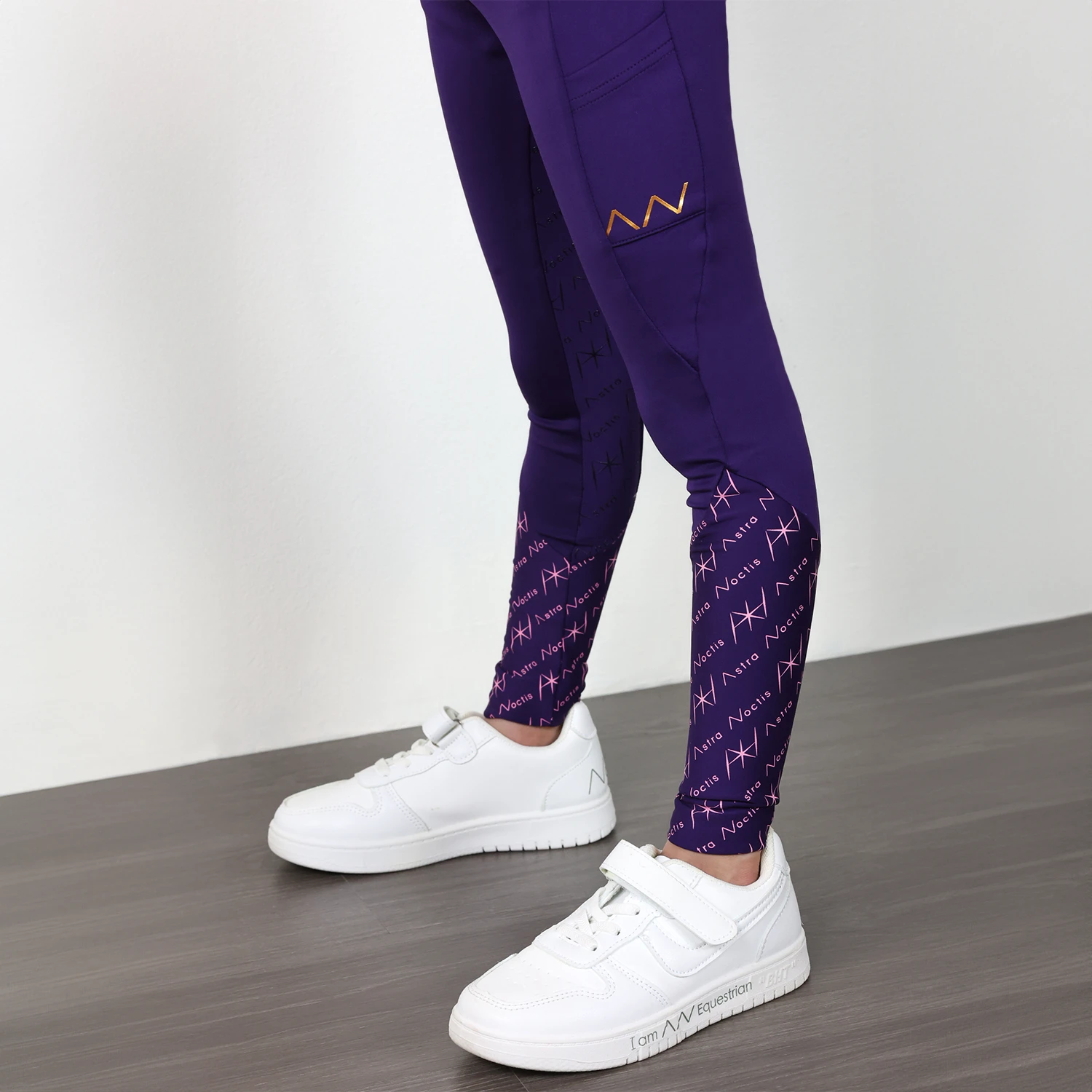 These high-waist leggings are the epitome of luxury and function for any equestrian. Designed with gold metallic accents, they feature “Astra Noctis” written on the back and a sleek phone pocket with our signature AN in gold. The silicone slogan “I am AN Equestrian” wraps around the waistband for a modern twist, while the gold pattern on the lower leg ensures you’ll stand out even when wearing low socks. Finished with a full seat silicone print for added comfort, these leggings are made to turn heads both in and out of the saddle.