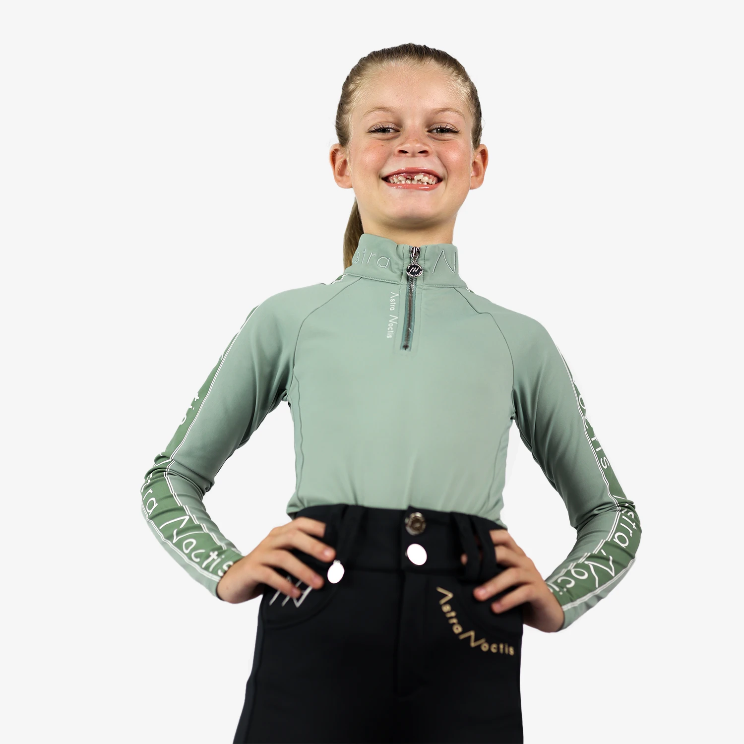 This sporty baselayer combines sleek design with high performance. Featuring “Astra Noctis” printed along the arms and back with bold parallel lines, it’s finished with a luxurious metal zipper and our signature charm. The branded embroidery on the collar adds a touch of elegance, making it both functional and stylish for any equestrian.