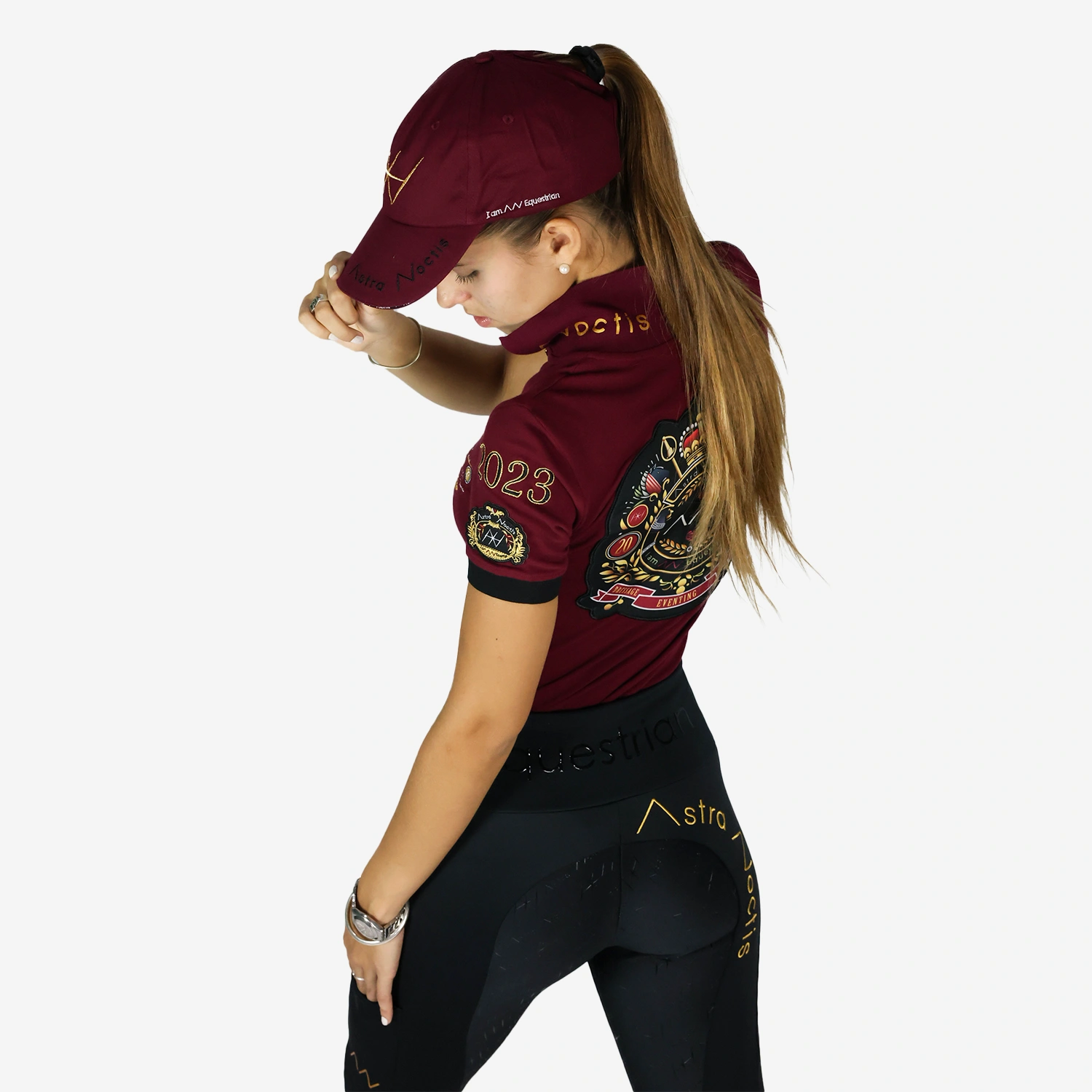 A striking combination of sport and elegance, this burgundy polo is crafted from advanced lightweight, stretchy, and quick-dry fabric. Designed to make a statement, it features eye-catching badges on the arm, a bold logo on the back, and an “Astra Noctis” branded collar that shines when worn up. Whether you’re a pro rider, hobbyist, coach, or groom, this polo will turn heads and keep you comfortable no matter the setting.
