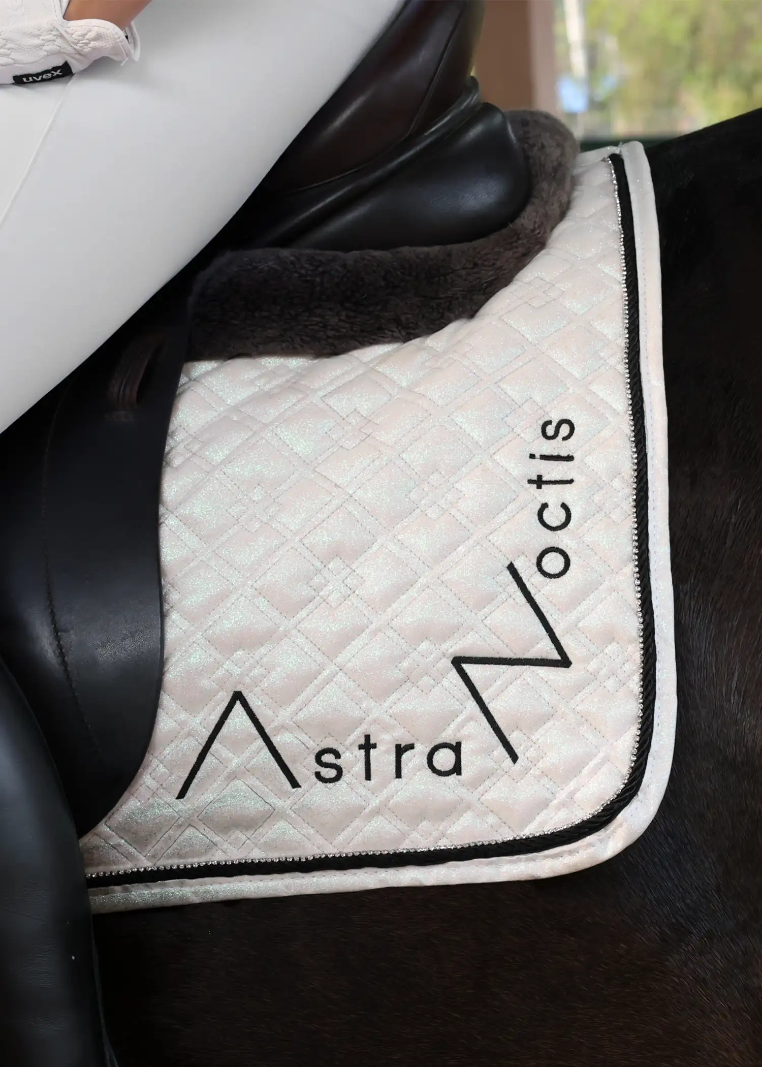 This competition saddle pad combines white glitter with a sleek design, making it both elegant and eye-catching. The motivational quote “FEARLESS” is embroidered onto the girth strap and spine, providing an extra boost of confidence before your ride. This pad is designed for all disciplines and is sure to sparkle under the sunlight. With grand logos on both sides, it is the ultimate combination of glamour and performance.
