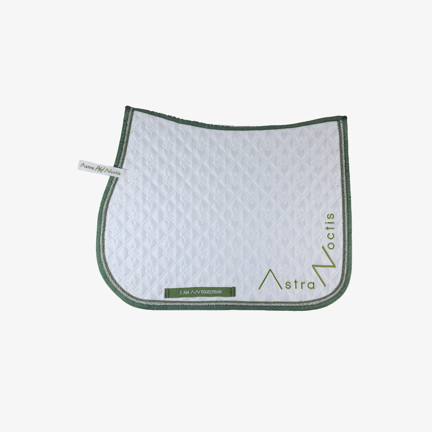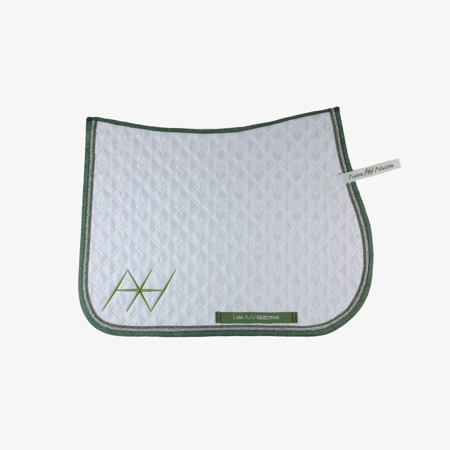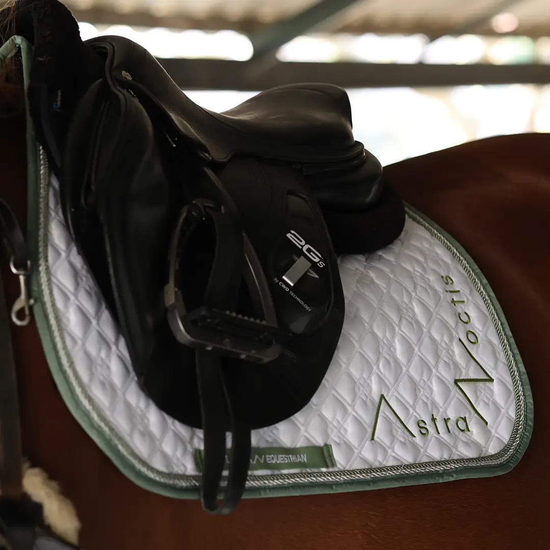 This beautiful competition saddle pad brings the classic white of competition gear together with our signature sage green. It features double piping for a luxurious look and grand logos on both sides. Designed with a motivational quote on the girth strap and spine, this saddle pad ensures you’ll feel stylish and inspired as you ride.