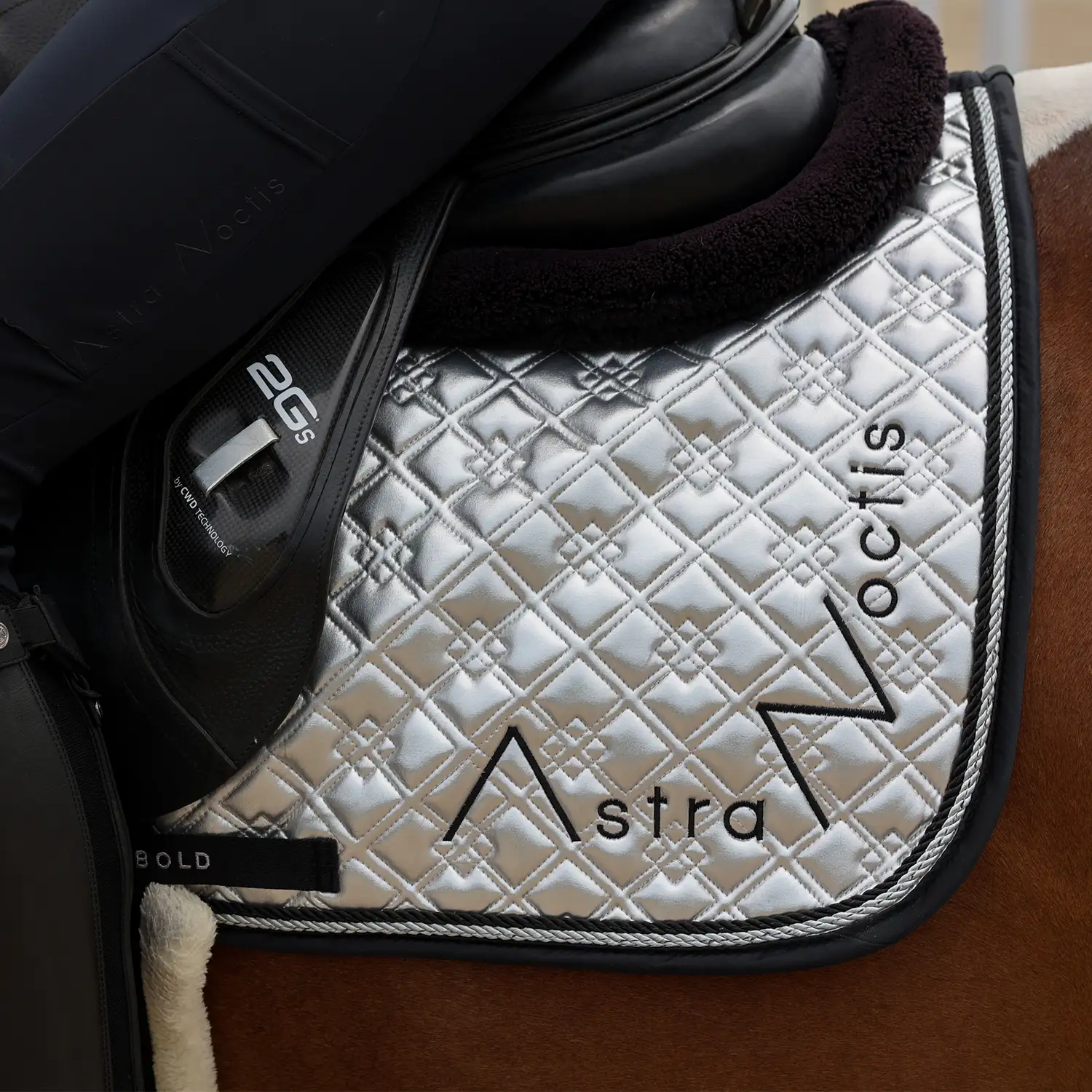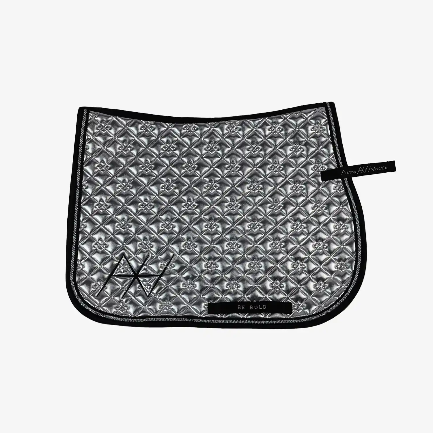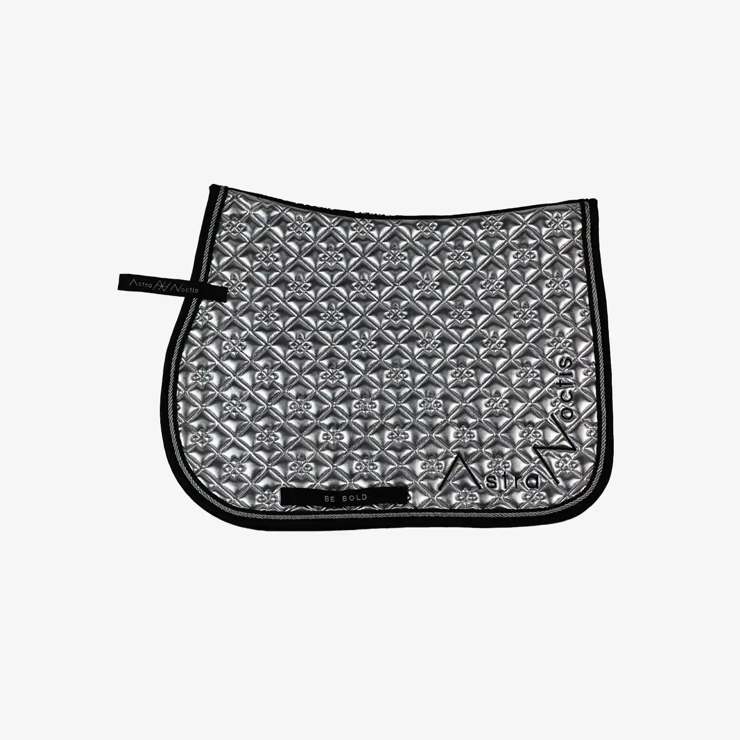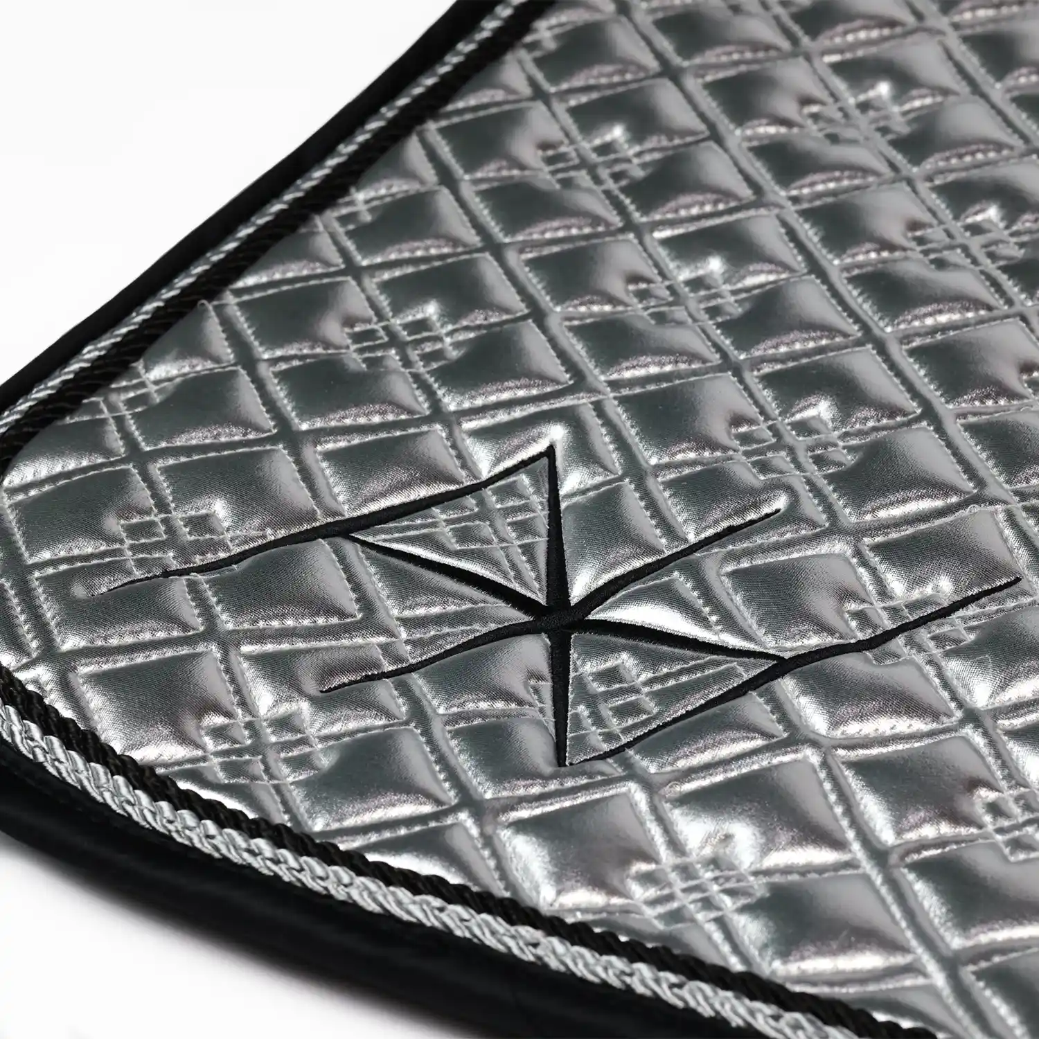 Make a bold statement with this stunning silver and black saddle pad. The shiny foil silver color is anything but ordinary, perfect for those looking to turn heads. With the motivational quote embroidered onto the girth strap and spine, this saddle pad is designed to inspire confidence. It’s the ultimate attention-grabber.