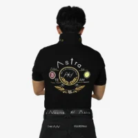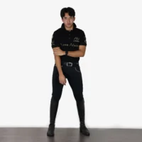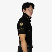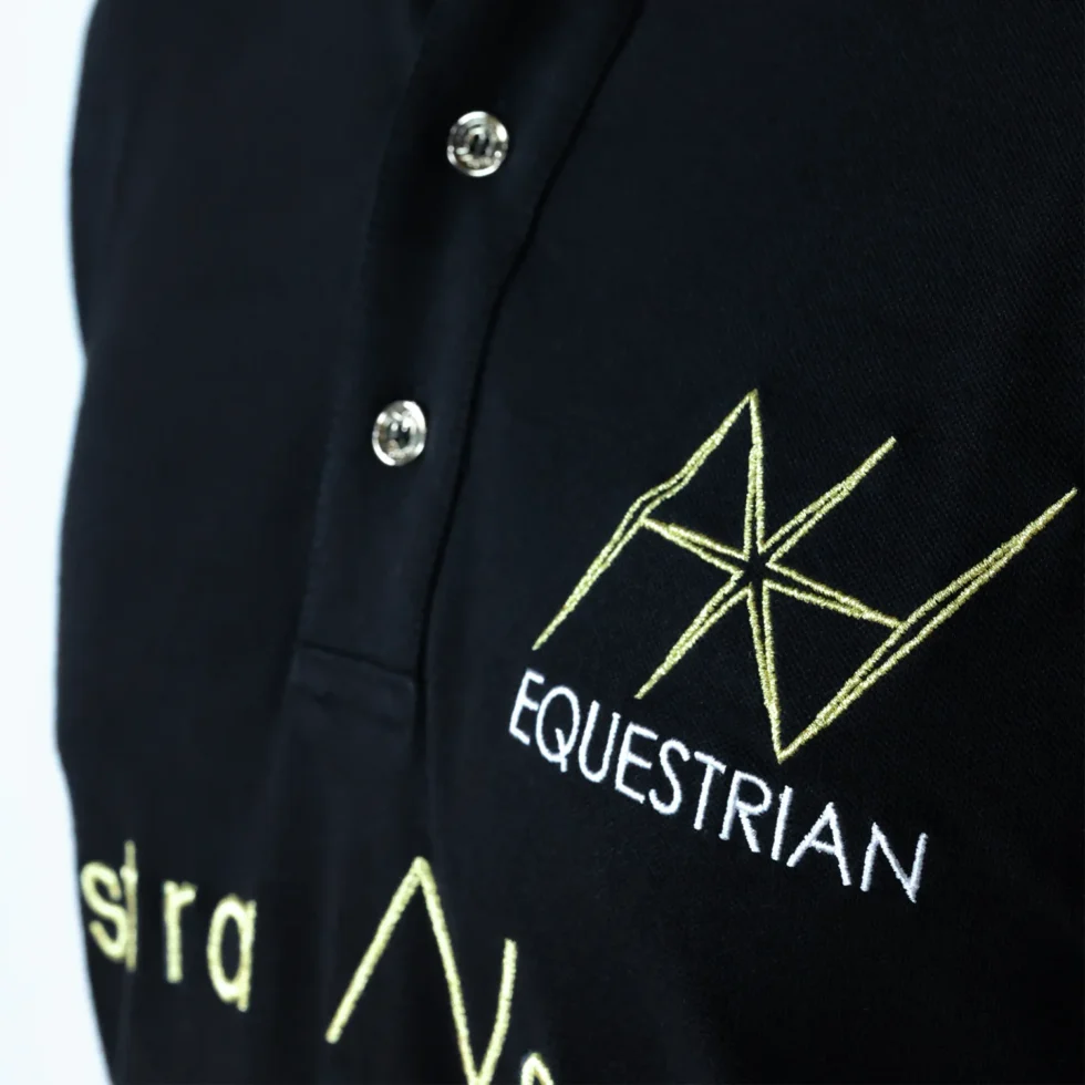 This classic black polo shirt blends luxurious gold accents with sporty white details for an elegant yet athletic look. Featuring patches and embroidery on the arms and a bold design on the back, it offers versatility with a collar that can be worn up or down. When standing, the collar reveals a hidden “Astra Noctis” print. With its timeless color palette of black, white, and gold, this polo is perfect for any occasion—whether in the saddle or out.