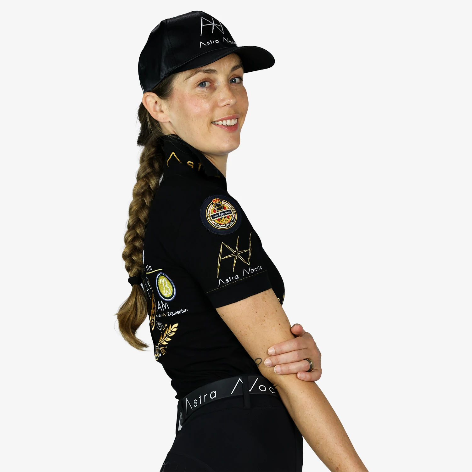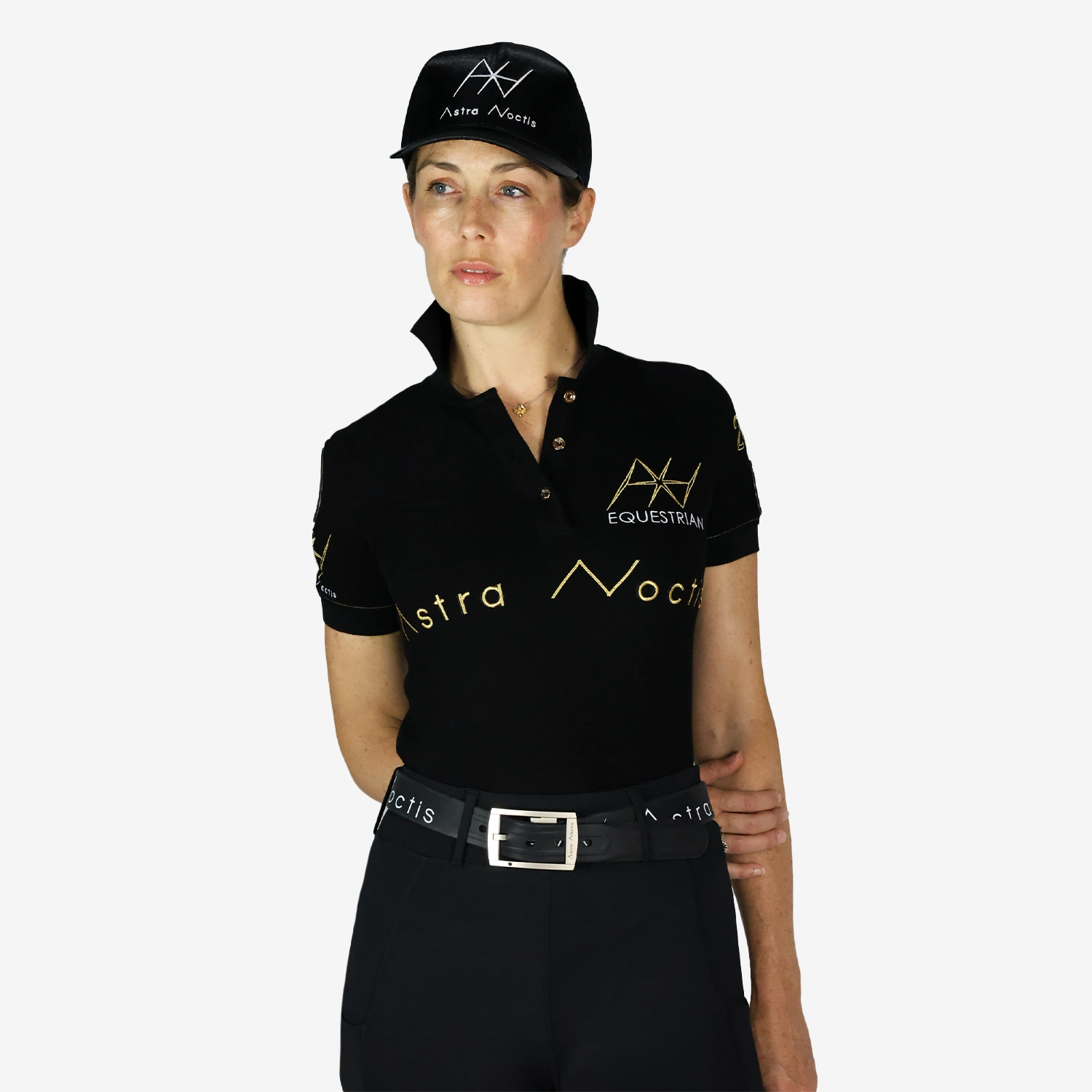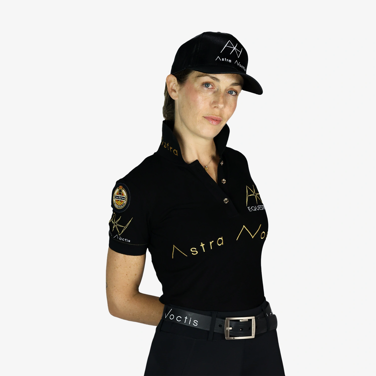 This classic black polo shirt blends luxurious gold accents with sporty white details for an elegant yet athletic look. Featuring patches and embroidery on the arms and a bold design on the back, it offers versatility with a collar that can be worn up or down. When standing, the collar reveals a hidden “Astra Noctis” print. With its timeless color palette of black, white, and gold, this polo is perfect for any occasion—whether in the saddle or out.